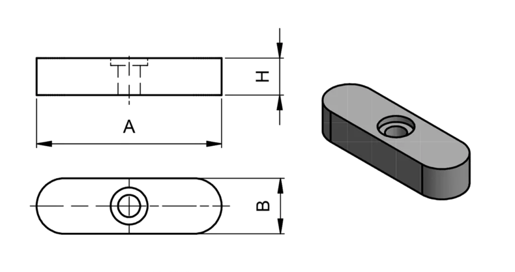 Formato: Retangular com extremidades arredondadas, furo central e rebaixo