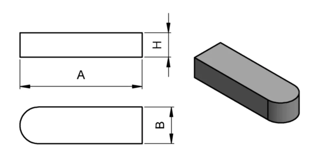A Chaveta Paralela com uma extremidade reta e outra arredondada é projetada para garantir o acoplamento firme entre eixo e cubo, proporcionando transmissão confiável de torque e evitando o deslizamento das peças. O formato híbrido, com uma ponta plana e outra arredondada, permite montagem facilitada e encaixe preciso em aplicações mecânicas específicas.