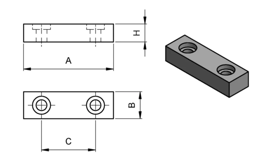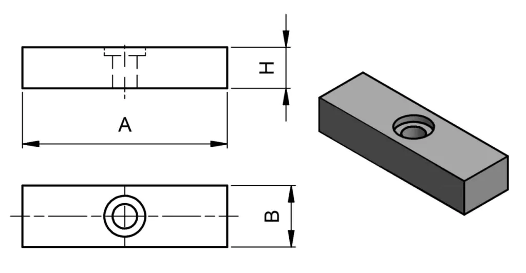 Formato: Retangular com chanfro em uma extremidade, um furo e um rebaixo