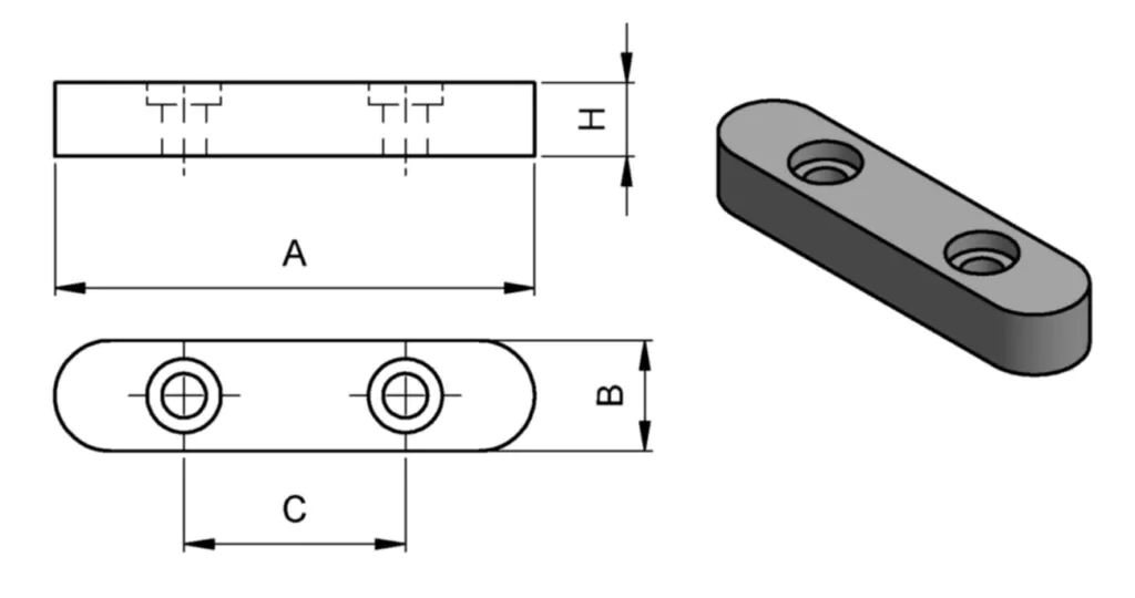 Formato: Retangular com extremidades arredondadas, dois furos e dois rebaixos